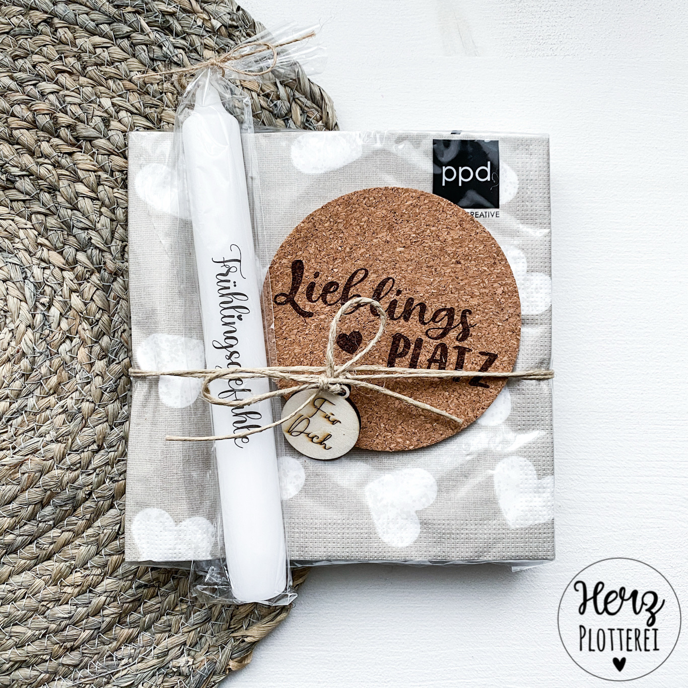 Kerze, Servietten, Schnur, Herzanhänger aus Holz