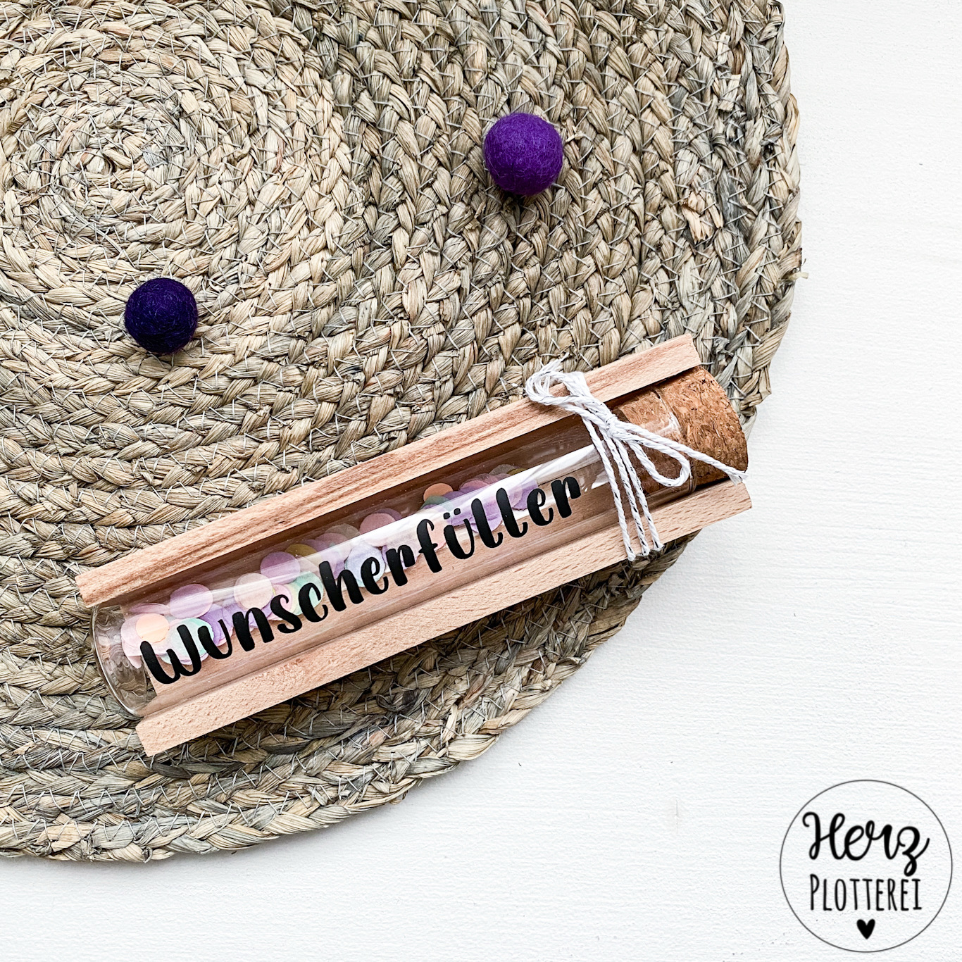 Holzklötzchen aus Buche, Reagenzglas aus Glas und Korken, Schnur, Sticker