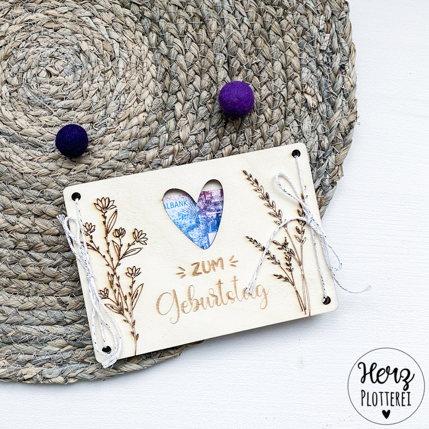 Diese liebevoll gestaltete Holzkarte ist eine originelle Möglichkeit, Geld oder einen Gutschein zu verschenken. Zwischen die beiden Holzteile kann ganz einfach ein Geldschein oder eine kleine Nachricht gelegt werden.