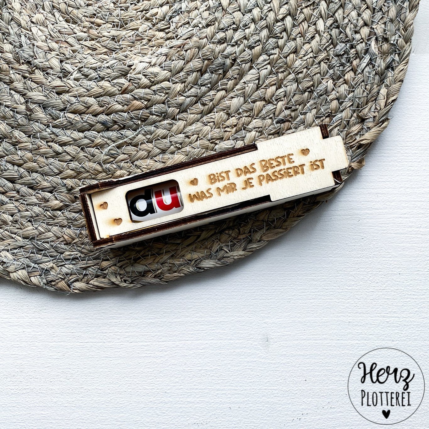 Diese liebevoll gestaltete Pralinenbox ist die perfekte Verpackung für Duplo Schokolade und sorgt für eine besondere Überraschung. Mit einem schönen Spruch wie „Du bist das Beste was mir je passiert ist“ wird sie zu einer persönlichen und herzlichen Geschenkidee.